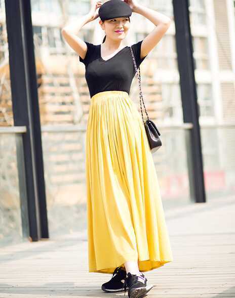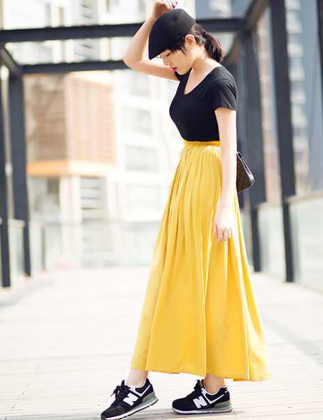 t恤搭配沙滩裙,简约大气,雪纺的质感超仙美,完美展现出你的小清新。