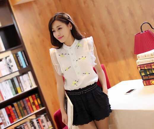 微透视欧根纱雪纺衫 ,仙美的感觉很迷人, 若隐若现的露出肌肤,优雅中带点小性感,荧光色的花朵为衣衣增添几分时尚感,搭配百搭的短裤,超时尚范儿。