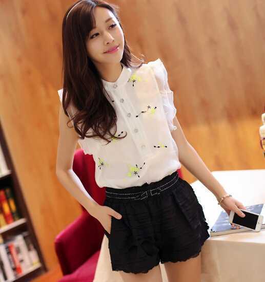 雪纺衫搭配短裤也能穿出斯斯文文的感觉喔,佩戴淑女韩版发箍,增添你的甜美度。
