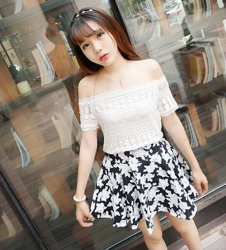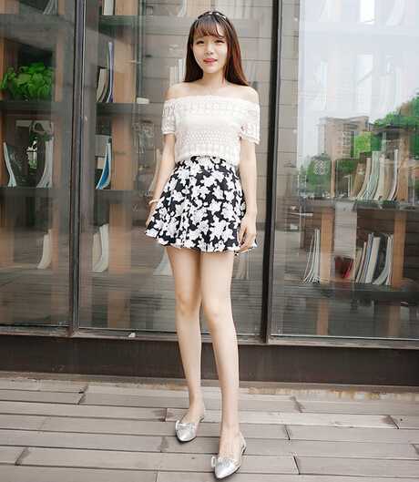 超显瘦的一款白色露肩t恤衫,露出锁骨和香肩,展现出女人般的性感诱惑,搭配短裙,超级萌哒哒的,加上蝴蝶结平底鞋,超级有气质。