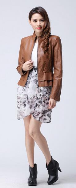 推荐搭配>>>>>>>黑白印花雪纺短裙+短靴。小立领咖啡色皮衣上原有的木耳边和荷花叶衣摆设计让本来酷帅的皮衣变得柔和起来,搭配上雪纺裙更是显得时尚和优雅。
