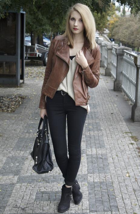 推荐搭配>>>>>>>灰色毛衣+深灰牛仔裤+黑色高跟鞋+咖啡色短款皮衣。灰色调给人一种低调的感觉,精致的高跟鞋再配上短款咖啡色皮衣,给整体带来一种优雅的大女人的气质。