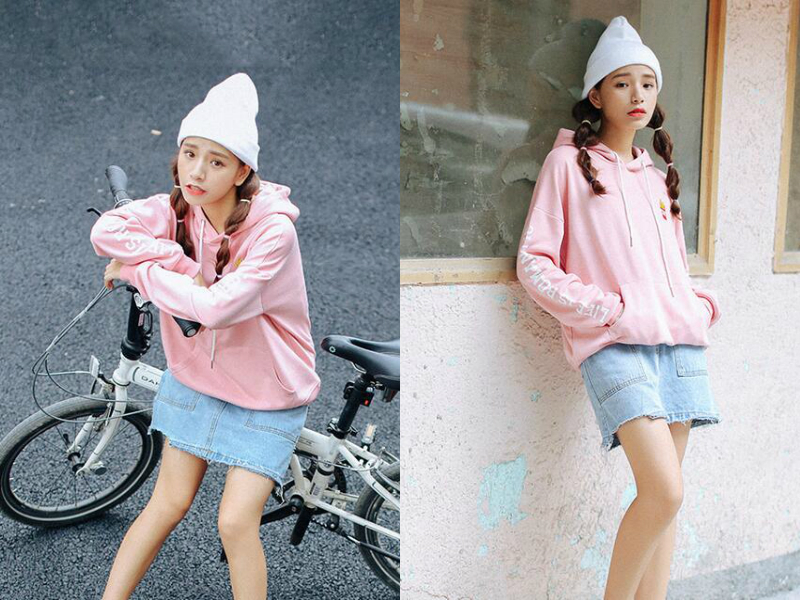 宽松版的粉红色连帽卫衣带着浓浓的学院风,卫衣袖子有字母图案,凸显清新时尚,下身搭配带有毛边的牛仔短裙,很有休闲街头风格,也显得青春活力。
