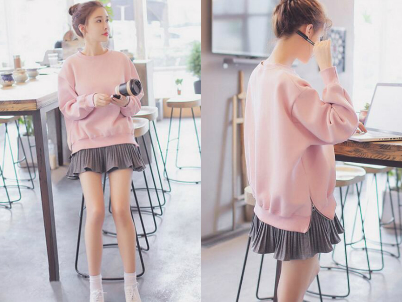粉红色可以衬托女生皮肤的柔细,带有稚嫩的感觉,这款粉红色卫衣采用拉链开叉的独特设计,灰色的百褶裙和粉红色卫衣搭配起来随性,整体看上去充满了甜美的少女风。