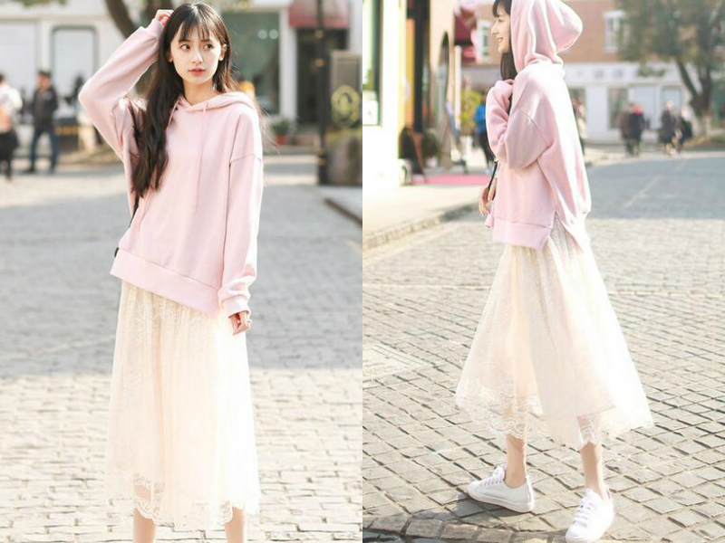 插肩袖的粉红色连帽卫衣休闲舒适,穿上去瞬间变甜美清新,裙子和粉红色卫衣搭配很适合,矮个子的女生可以搭配短裙,高个子搭配长裙,搭配雪纺长裙弥漫了仙味。