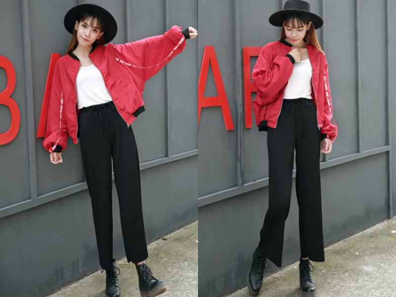 搭配3:红色外套+黑色长裤