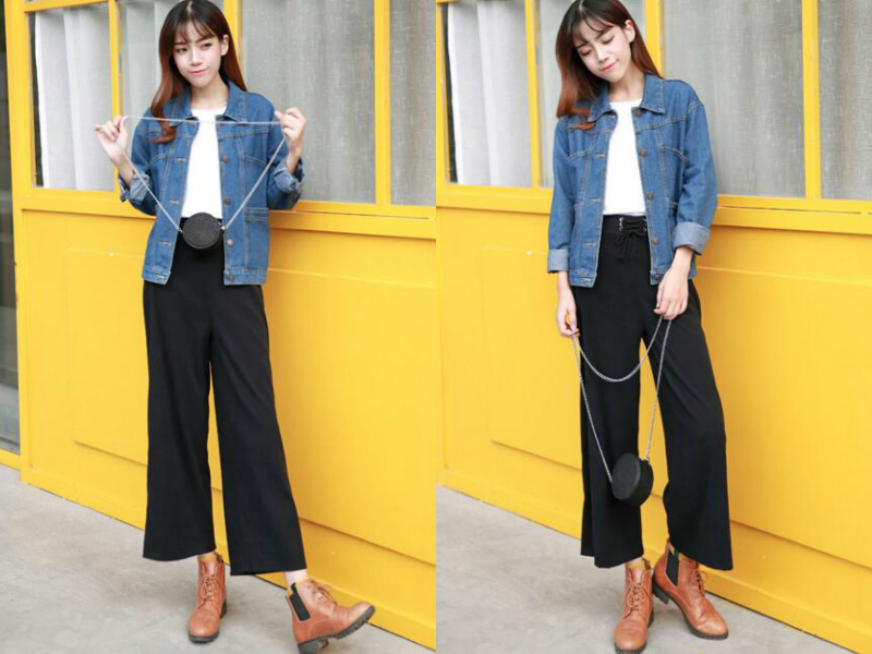 同是一款以纯色白t加黑色长裤作为基础内搭的造型,不过此款裤子是阔腿设计,显得要随意轻松很多,外搭一件永远不会过时的深蓝色牛仔外套,还有一个可爱的黑色小包,整体风格虽低调却也够时尚了。