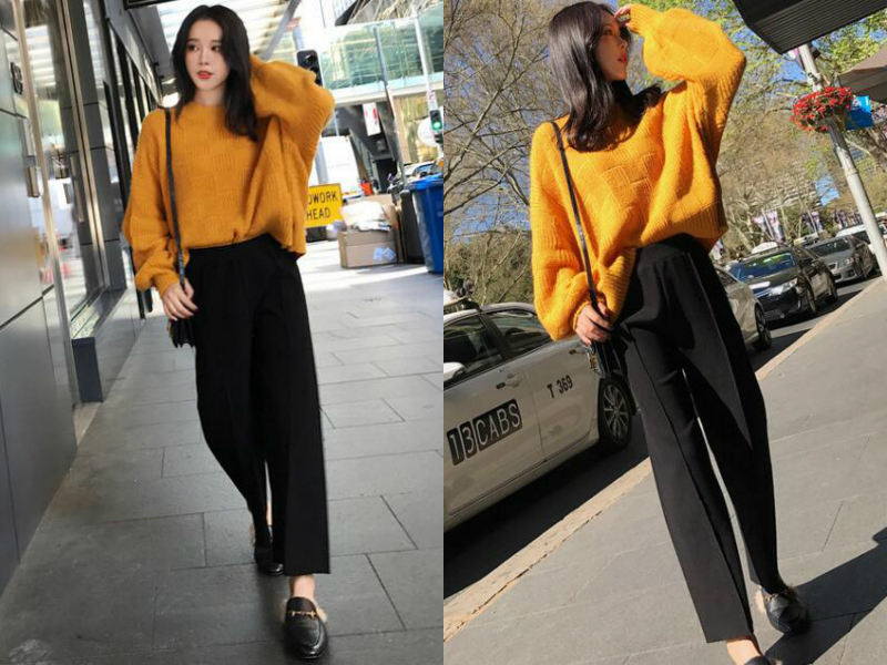 黄色毛衣料子亲肤舒适,加上黄色让人联想到太阳的颜色,所以看着便觉得温暖,搭配纯黑色的长裤,并把毛衣下摆随意地塞进裤子里,时尚的造型轻松便凹出来,在优雅的中分齐肩发映衬下,又展现出女生知性的气质。