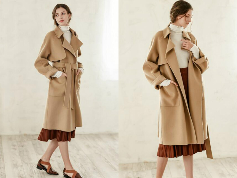 很简洁的一款长款驼色大衣,没有纽扣只用腰带的设计可以拉高妹子的腰线,加上内搭的高腰半身裙,更使妹子看起来身材高挑,有种模特上身的错觉,穿上一件米白色的打底衫,瞬间变得优雅动人。
