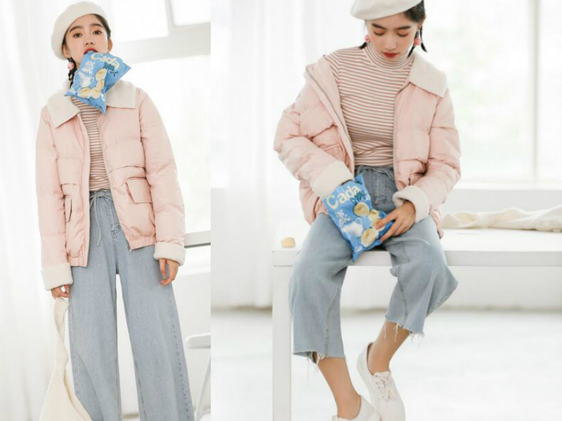看起来很活泼的一款服饰搭配look,内穿一件细条纹的打底衫,外套一件粉色短款棉外套,二者颜色相近,显得很粉嫩,下装搭配一条浅蓝色的阔腿牛仔裤,宽松的版型遮肉显瘦,整套装扮看下来既休闲又可爱,对于软妹子来说是个不错的选择哦!