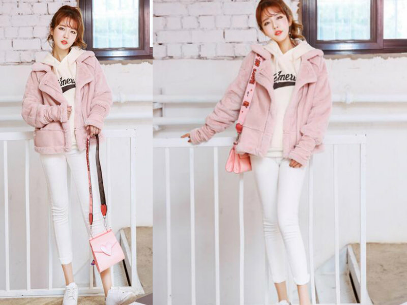 粉色的羊羔外套看起来毛绒绒的,衬得妹子娇俏可人,内搭一件粉白色的连帽卫衣,增添休闲feel,搭配的裤子是一条白色的紧身裤,修饰了妹子的完美腿型。由于下半身搭配的都是白色系,因此使人的注意力集中于上半身,更凸显妹子的甜美少女气质。