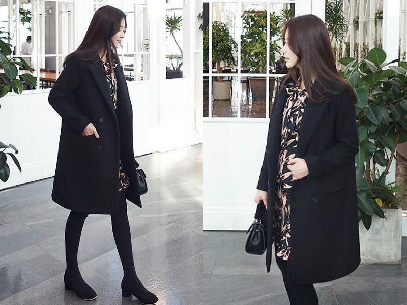 碎花裙是一年四季都很适合的裙子款式,冬天穿也并不简单。把一条有着不规则花纹的连衣裙穿在里面,显得时尚且清新,外搭一件中长款的黑色呢大衣,裙子与外套长度差不多,腿上穿一条黑色裤袜,脚上配一双黑色粗跟鞋,整体色泽连贯性强,能达到很好的显瘦效果呢!
