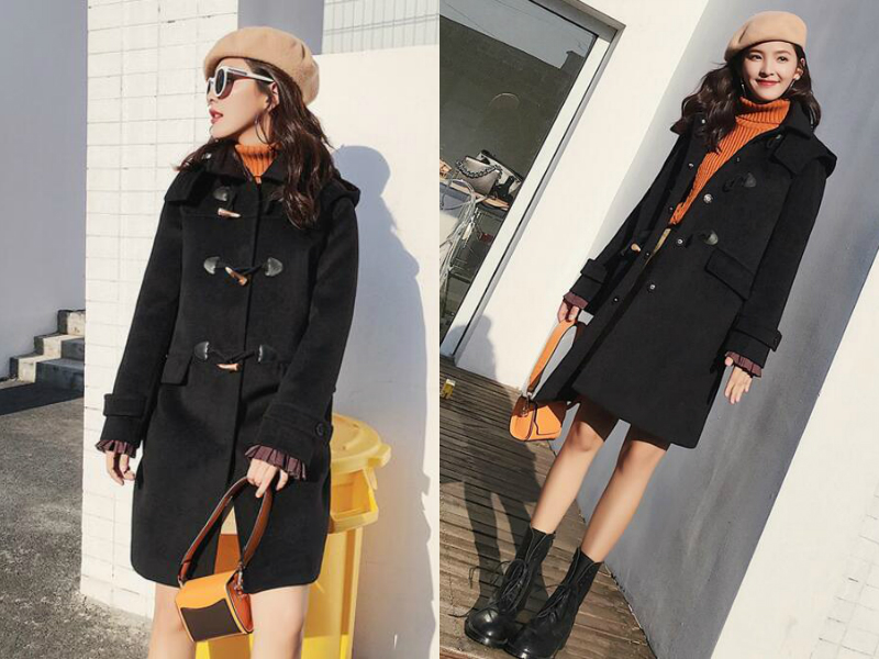 牛角扣设计使这件黑色呢大衣充满学院风,减龄效果使妹子穿上后显得年轻朝气,内搭一件橙色的高领毛衣,保暖的同时更带来新鲜活力感,下边则搭配一条半身裙,把大衣扣子一系,整个人瞬间拉长,显得高挑而有气质。