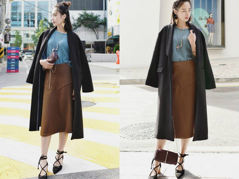 以一件灰蓝色的打底衫搭配一件棕色半身长裙,看起来较简单舒服,再加上把打底衫束进裙子里,腰线立刻提高,再把黑色大衣披在肩上,显得很有范,整个人时髦得来又充满御姐气场。