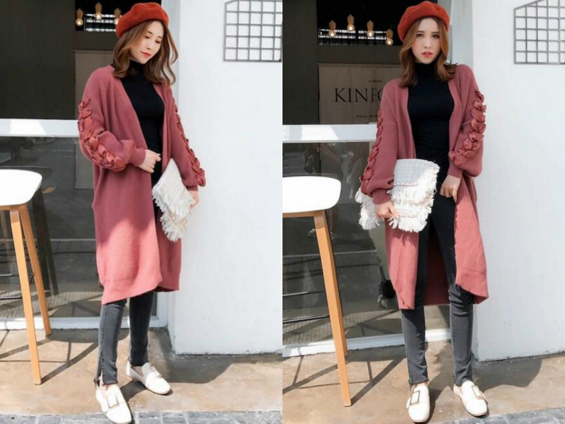 黑色打底毛衣,灰色的裤子,一件暗红紫色的长款针织外套,不同颜色,相同高的色调得搭配和谐又统一,给人恬静娴淑的感觉,还有显瘦显高效果,再加上橘红色帽子和杏色色包包、鞋子的色彩搭配,衣服颜色变得丰富有层次非常漂亮。