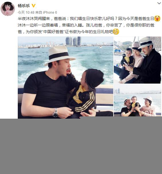 杨乐乐为汪涵庆生,直言:孩儿他爸你辛苦了,微博上的照片中,小沐沐呆萌出镜,亲手给汪涵喂食,很有爱。