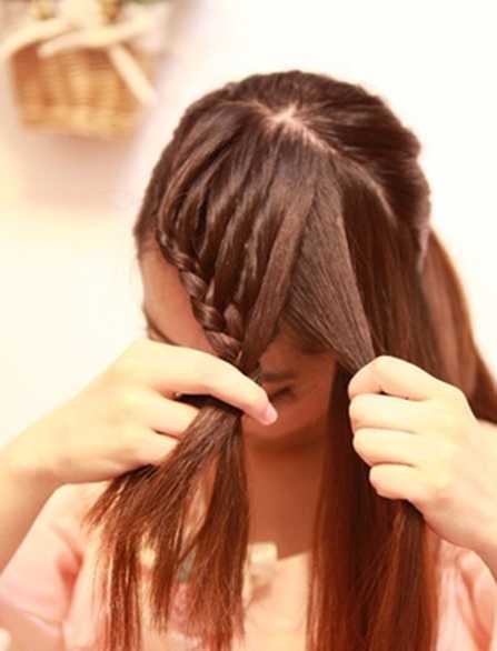 将额头留下来的头发一点一点逐渐加入到三股辫里,弄好一点哦,这样看起来会更好看哦。
