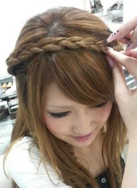 把编好的麻花辫绕过头顶,再用发夹夹好发发尾。