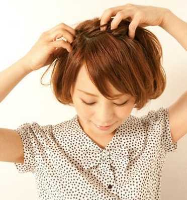 先将短发梳理好,如图中MM的波波头,如果想显得甜美一点,可以留着斜刘海。