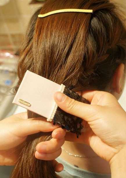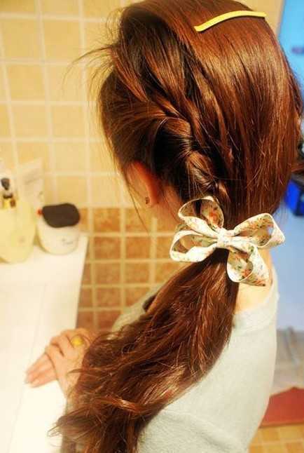 步骤四:留出来中间的头发,可以用个长式夹子夹住,图示,然后,将左右两边编好的发辫往左边放,绑在一起,这次用的是蝴蝶结发圈,超好看的!很甜美!