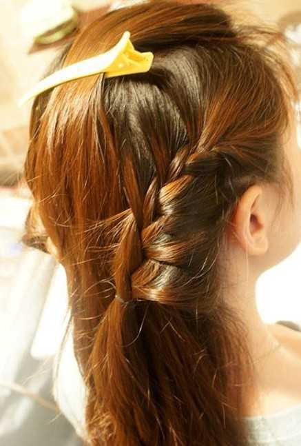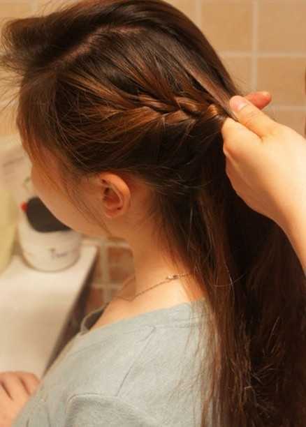 步骤一:将后面的头发分成三份,左、中、右各一份,首先将左边的头发编成三股编形状,图示。