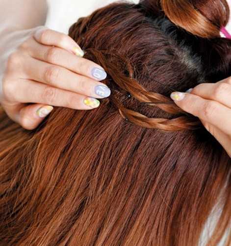 Step1:从脑后取出一束头发固定好,在前面的刘海取出几束头发扭转起来,用发夹固定好。