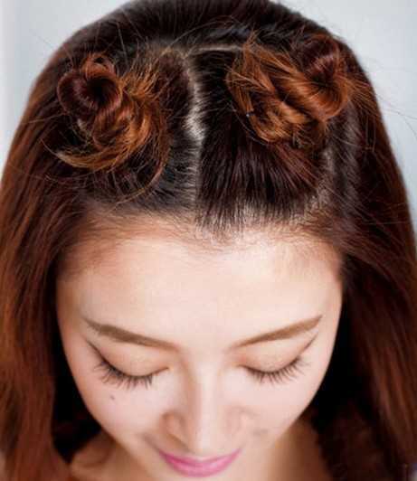 Step1:图示,按照图示中从前面划分出一定的区域,将分开后的发束扭转起来,再用发夹固定好!