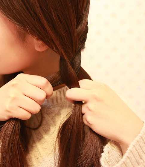 一直编到发尾的位置,用胶圈绑住,另一边也是同样的方法。
