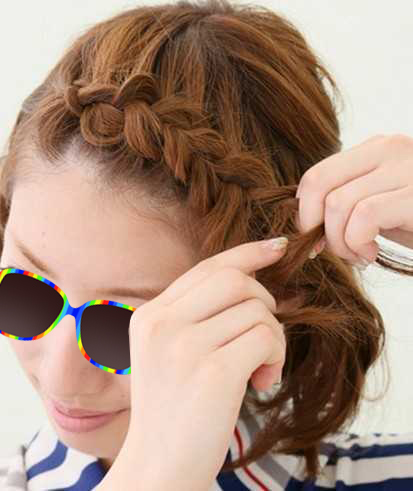 5、如图上,把所剩下的头发用手拉直后,添置在麻花辫的上面。