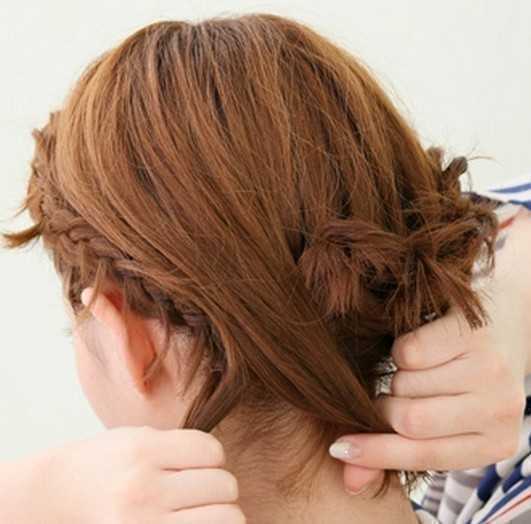 3、在额头前的刘海往左边抽取一束头发编织蓬松的麻花辫形状,使用橡皮筋扎好后,再绕着后脑固定位置。