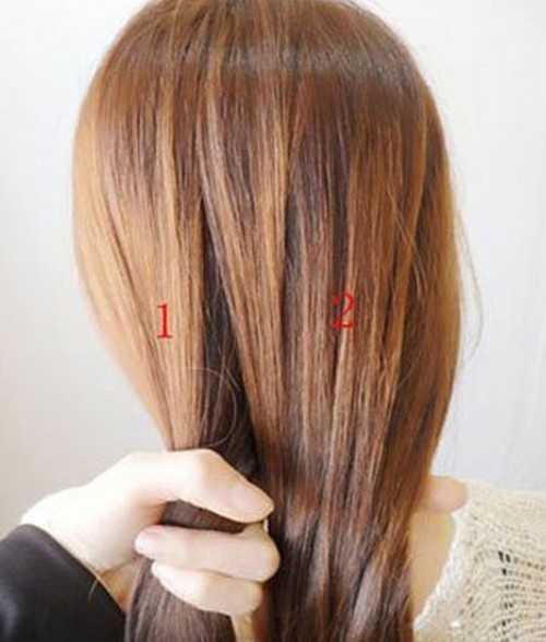 1、梳理全部头发后,把头发分为两部分,如图上的1、2作标记。