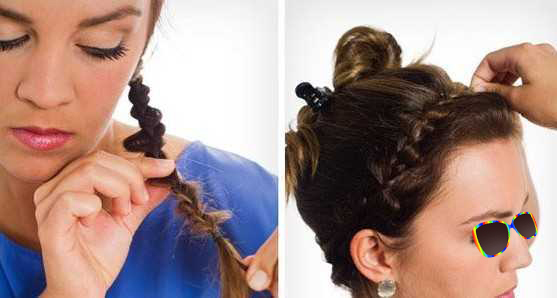 4、然后把两股小麻花辫在顶部处缠绕为一个花环式的形状。
