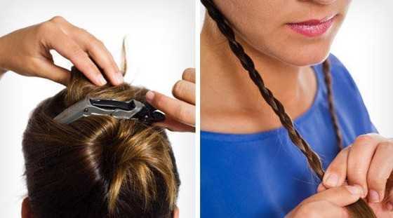 2、把下部分的头发均分两部分后,分别编织为简单的的小麻花辫形状。