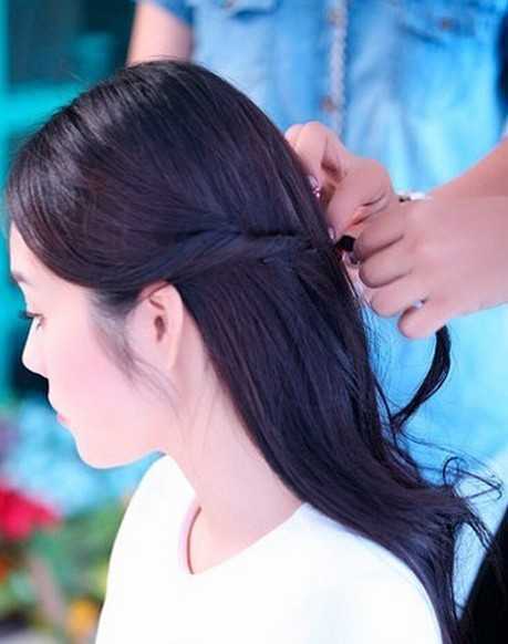 2、然后在左侧耳朵上方选择一小发束,往脑后扭转起来。