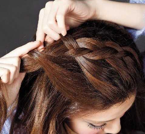 1、先把头发进行简单梳理后,选取刘海处的头发进行三股发辫往后编织起来。