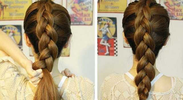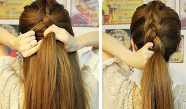 步骤三:编到脖子处的时候,就将剩下的头发按照麻花辫来编,编到发尾的时候用皮筋固定好。