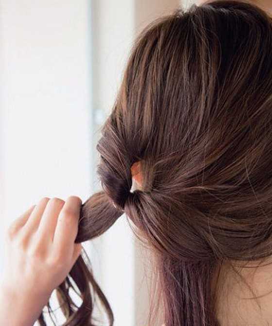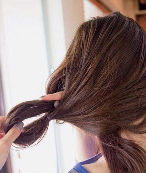 4、而下部分的头发使用橡皮筋扎好,发束从发结上方的小孔旋转穿过。