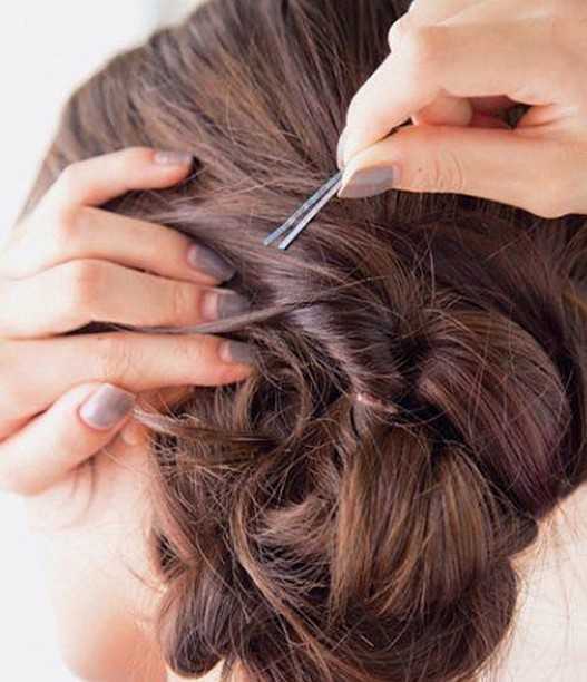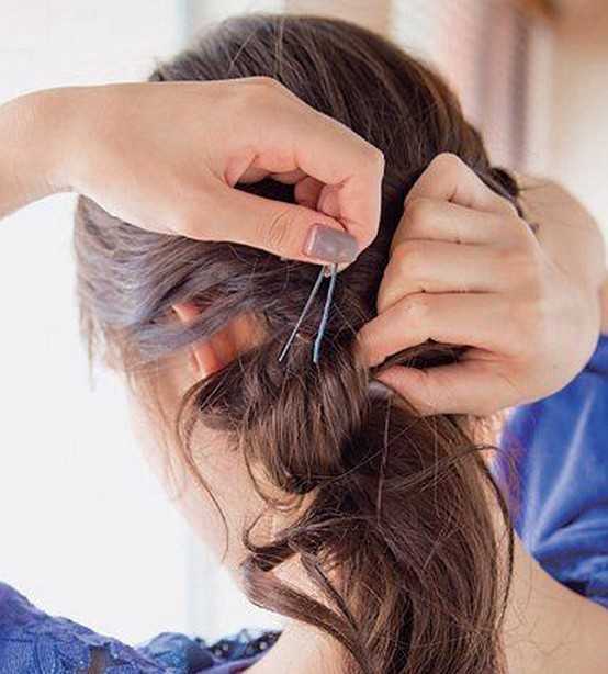 6、使用发夹固定起来,再将外翘的发梢塞入发束中去。