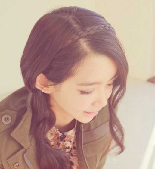 唯美浪漫感觉的韩式发型图片,微卷长发侧扎的小发尾,淑女温婉气质尽显,在顶部处编织起花环小发辫,卷刘海发丝垂落脸颊上,慵懒气质小女人范!