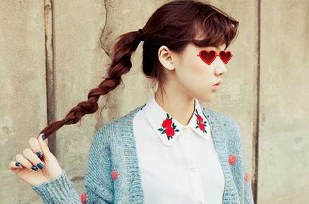 韩式的小脸萝莉女生,棕红的染发色长发下,简单扎个麻花编发,用手轻轻一拉的效果,天真活力十足,卷卷的齐刘海完美修颜且时尚!
