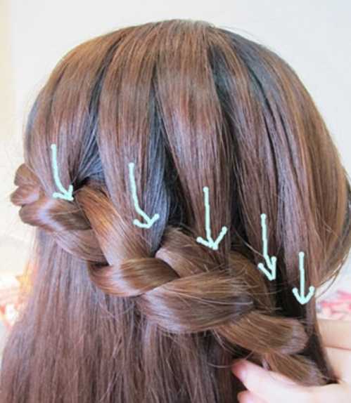 3、在编发的过程中编一下就隔段往发辫里加发束,如图所示。