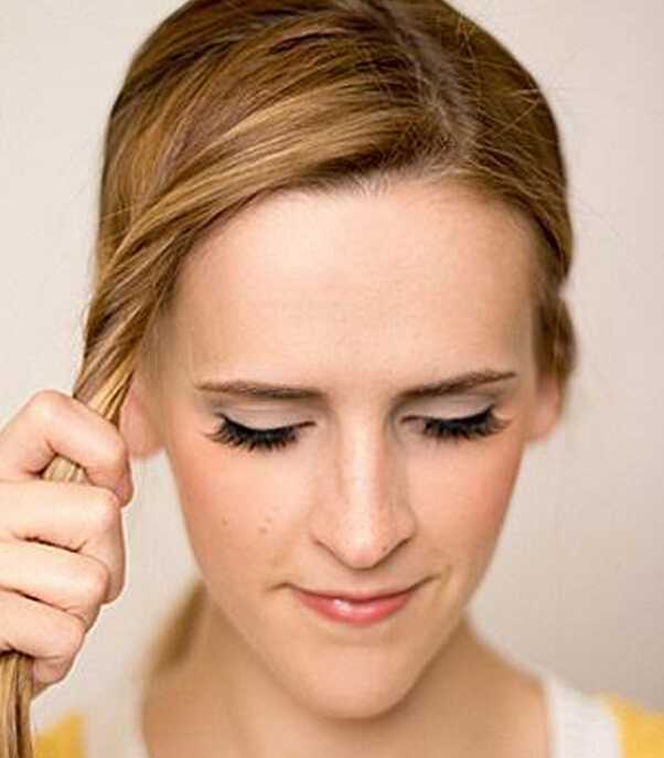 步骤七:之后把前面的头发压住上面那束头发往后拉扯,接着在前面添加一小股头发继续进行交叉编织下去。