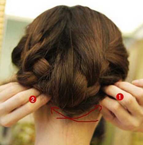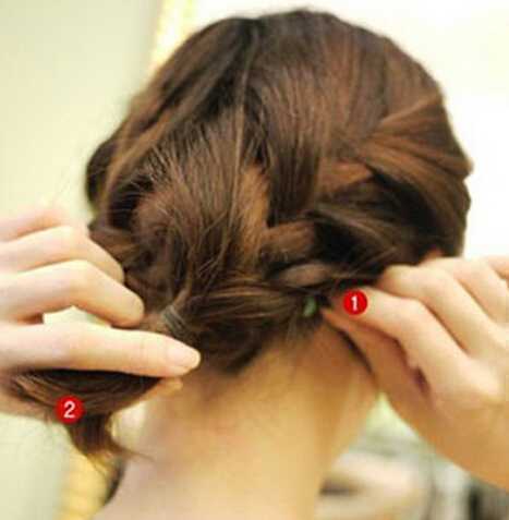 步骤8、把2号发尾向1号发尾内收,两个发尾形成交叉状,也是用发夹固定好;