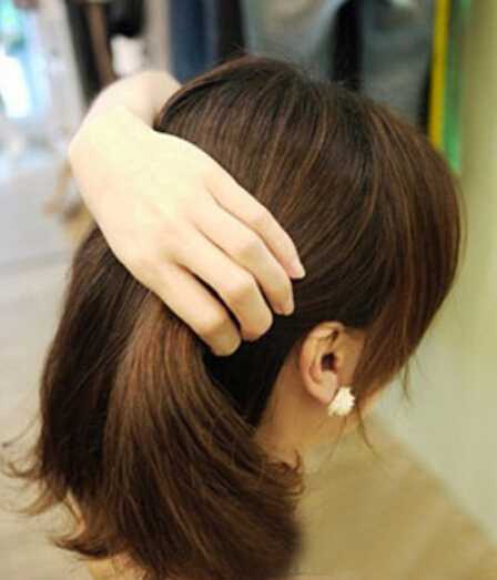 步骤1、先简单的梳理一下齐肩短发,再从后面将头发分成两部分,用手把右侧的头发聚拢到右边耳朵后面;