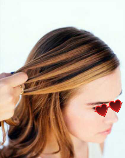 tips2、从多刘海侧开始,用右手在多刘海侧往右侧梳刘海,取手指夹住的三股头发;