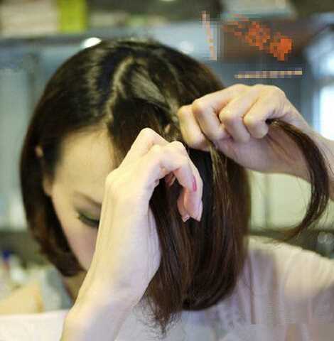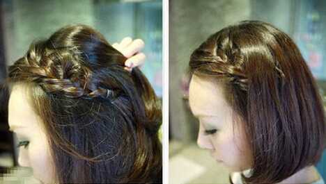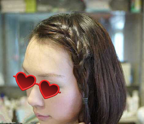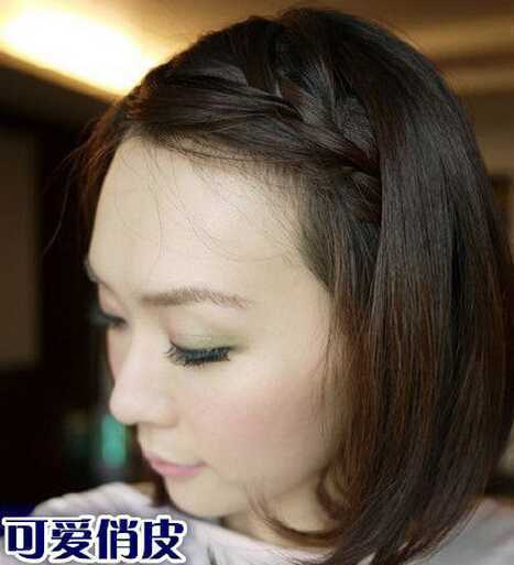 效果图:短发妹子编出来的效果是这样的哦,长刘海侧编成一条蜈蚣辫,再把蜈蚣辫尾端往耳后固定一下,超简单的哦。
