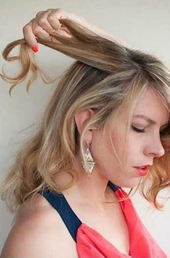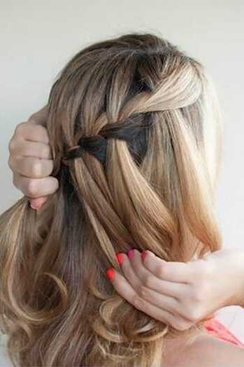 step4、按照以上操作一直编下去,编的时候除了原来剩下的2股头发还要从上下分别拿一束头发,上面的头发自然放下,以打造瀑布效果,下面拿起的头发参与到下一步的操作;