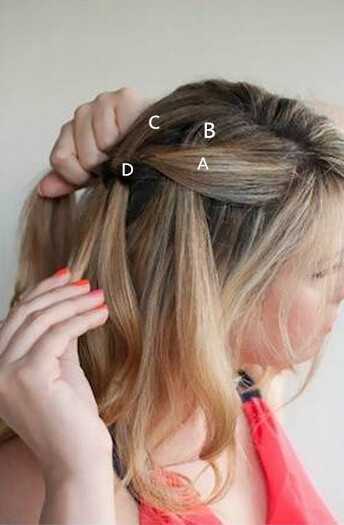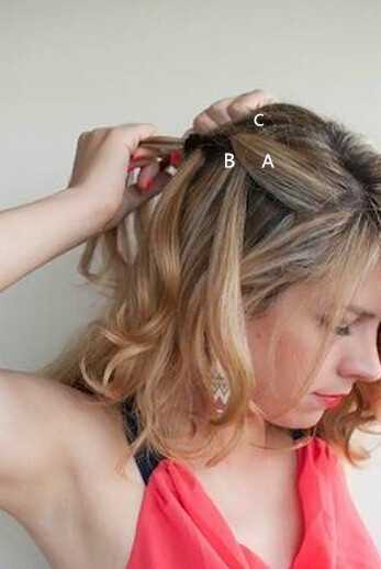 step2、把拿起来的头发分成三等分,为了更多的把头发区分开,我们用不同的字母把这3份头发标志好,靠近前额的为A,中分那份为B,接近后面那份是C,B头发自然放下,A头发从B头发上过去;