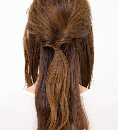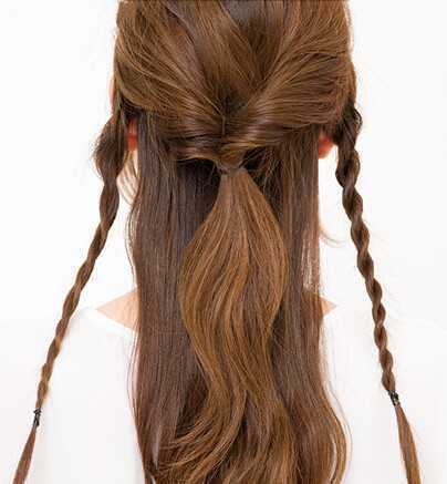 步骤一:从脑后两侧处挑选出两束头发,扭转后用发圈扎起来。