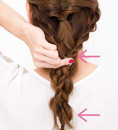 步骤三:如图所示,将最先扎起的发辫与剩余的头发编成一条大的三股辫。